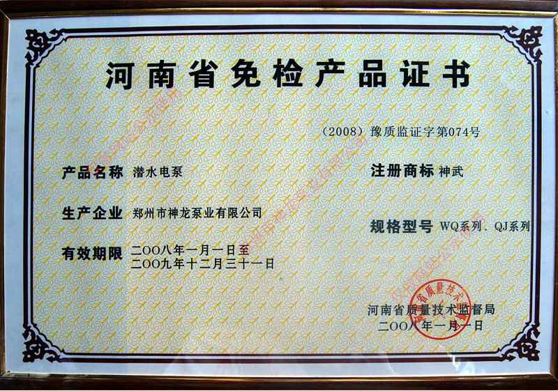 河南省免检证书
